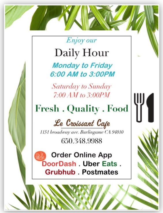 Le Croissant Cafe, located in Burlingame, CA, offers a delightful menu covering breakfast and brunch options along with coffee and tea. The cafe provides a cozy atmosphere with options for delivery, takeout, and outdoor seating. Customers rave about the flavorful croissant sandwiches like the Ham Croissandwich and the Green Egg & Ham Omelet. The Lite n' Healthy section offers a variety of lighter options such as the Ham & Cheese Croissant and Yogurt Parfait. Visitors praise the friendly service and fresh ingredients, making it a must-visit spot in downtown Burlingame for a delicious breakfast or brunch. Don't miss out on trying their pastries and sandwiches - a true gem for food enthusiasts seeking quality and convenience.